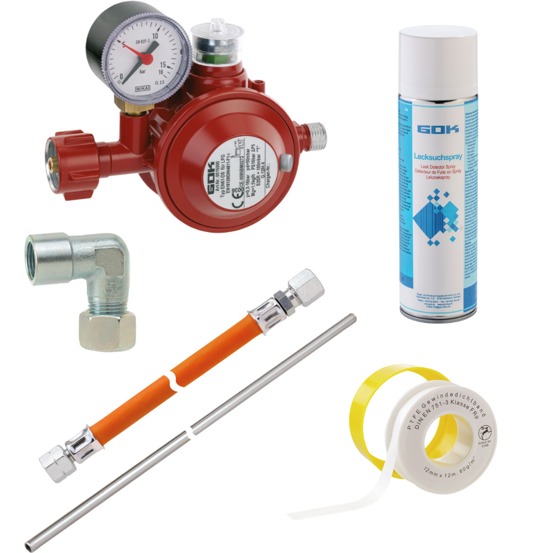 Mit diesem Set haben Sie die Möglichkeit, Ihr Gaskochfeld oder Ihr Standgerät in geschlossenen Räumen (z.B. Küche) mit Flaschengas zu betreiben. Der benötigte Betriebsdruck (In Deutschland und Österreich 50 mbar) geht immer vom Verbrauchsgerät aus. Daher achten Sie bitte vor dem Kauf auf die Betriebsplakette des Gerätes.